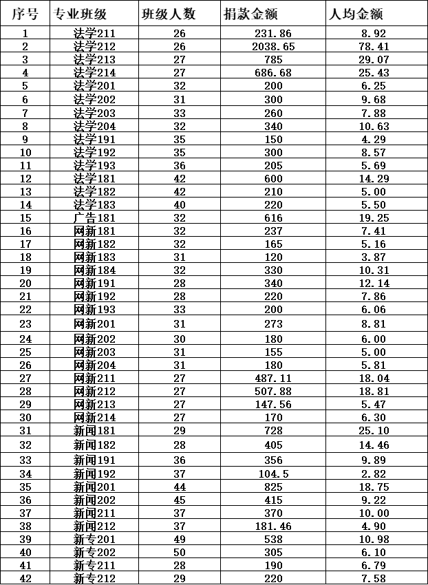 经广泛宣传发动和组织,学院第17次“学生爱心基金”集中募集活动已圆满结束。在本次募集过程中,各班级精心组织,广大同学踊跃捐款,用自己的实际行动唱响了“让节俭成为一种习惯,让关爱成为一种品质”的口号,营造出全院学生积极参与,奉献爱心的良好氛围,截至2022年1月8日,捐款金额共计15493.7元。现将各班级“学生爱心基金”集中募集金额和各类先进名单予以公布。