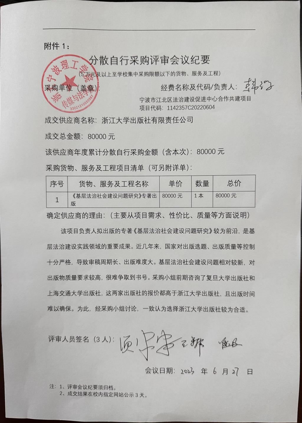 9778818威尼斯“基层法治社会建设问题研究”专著出版自行分散采购项目成交结果的公示