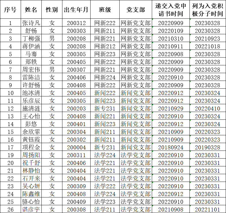 经党支部培养教育和考察,在听取培养联系人、党员和群众意见的基础上经各支部委员会讨论,党委审议,拟确定张诗凡等26名同志为发展对象,现将其有关情况公示如下: