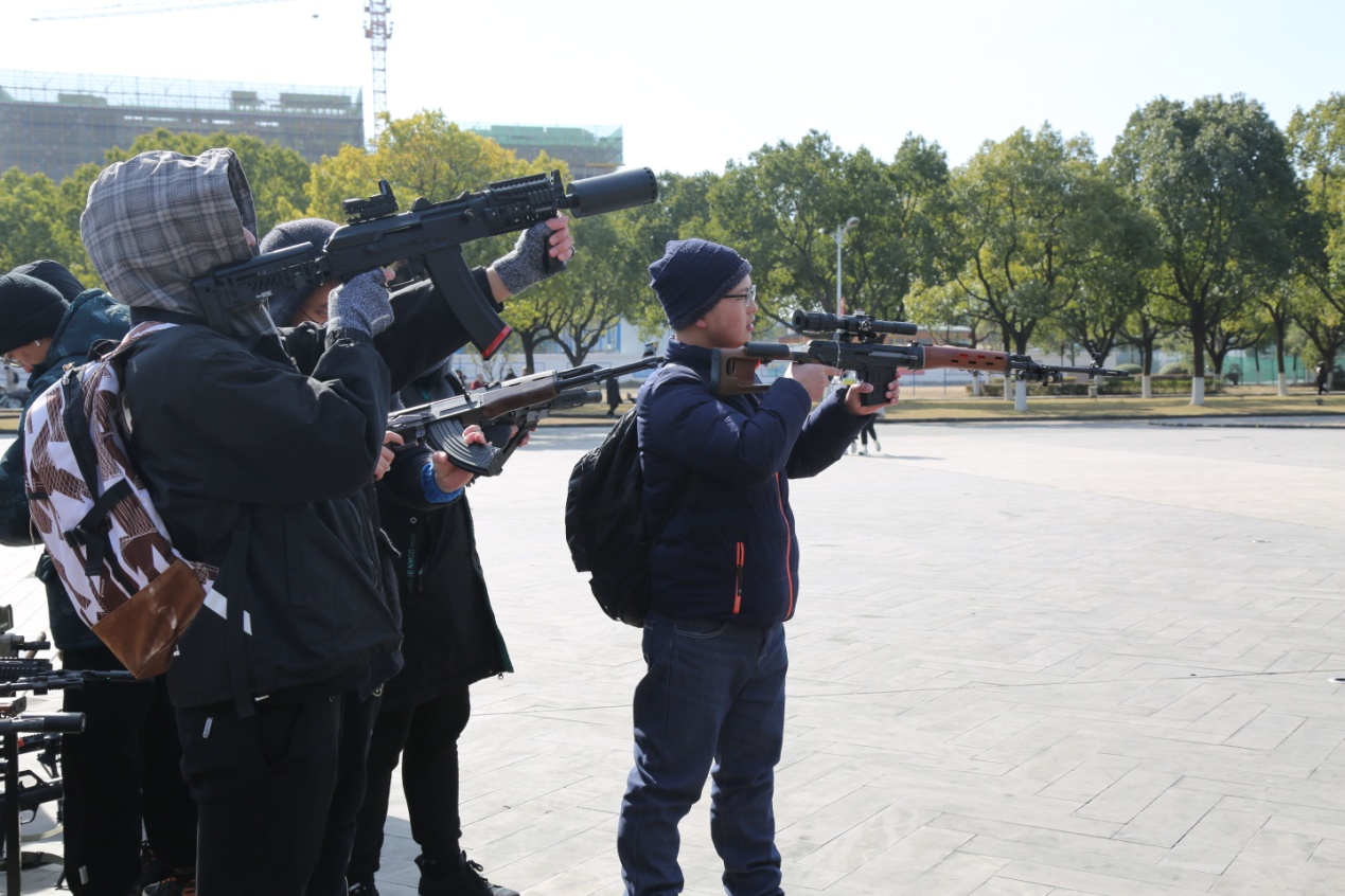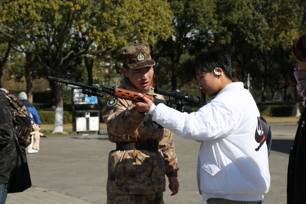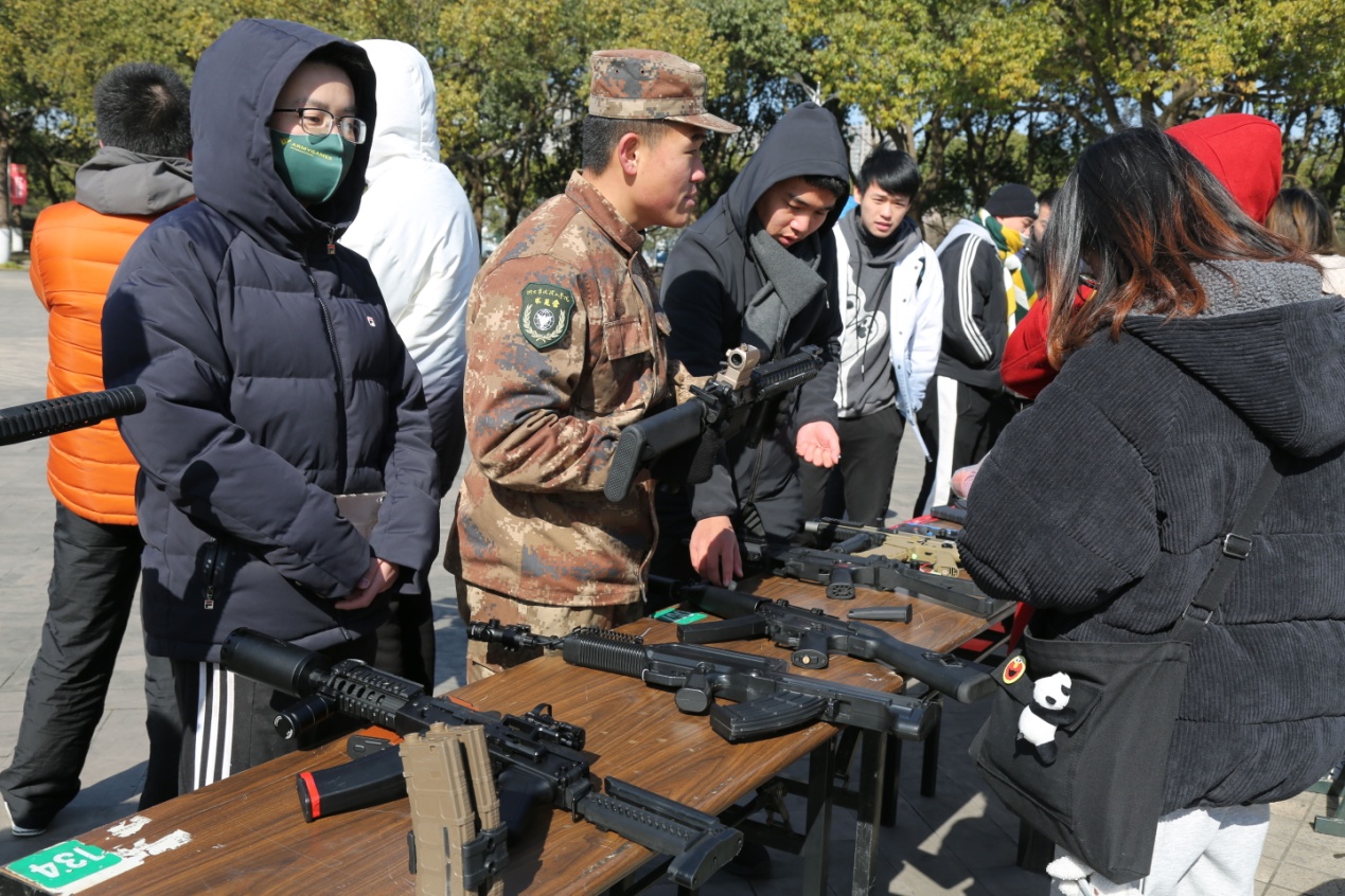 活动主要分为两部分:第一部分为持枪体验。学校军协给同学们提供了道具枪支,并由退伍军人现场进行了持枪、射击等姿势的示范。看着长桌上整齐排列着的各式各样的枪支和退伍军人们英姿飒爽的身影,同学们都忍不住跃跃欲试,纷纷拿起了枪支,在心里默念着持枪射击的要点进行了体验,同时也对枪支有了最基本的认识,更激起了大家的爱国热情。第二部分则是对急救知识方面的科普。军协人员针对头部、手部、面部等不同部位受伤的情况,依次做了包扎的正确示范。同学们自发围成一个圈儿,认真观摩着教学过程,并在演示后俩俩组队自己上手当了一回“医护人员”,期间难免有些模糊和错误的步骤,专业人员便会上前耐心得再次做出演示,反复过后,大家都顺利完成了包扎任务。