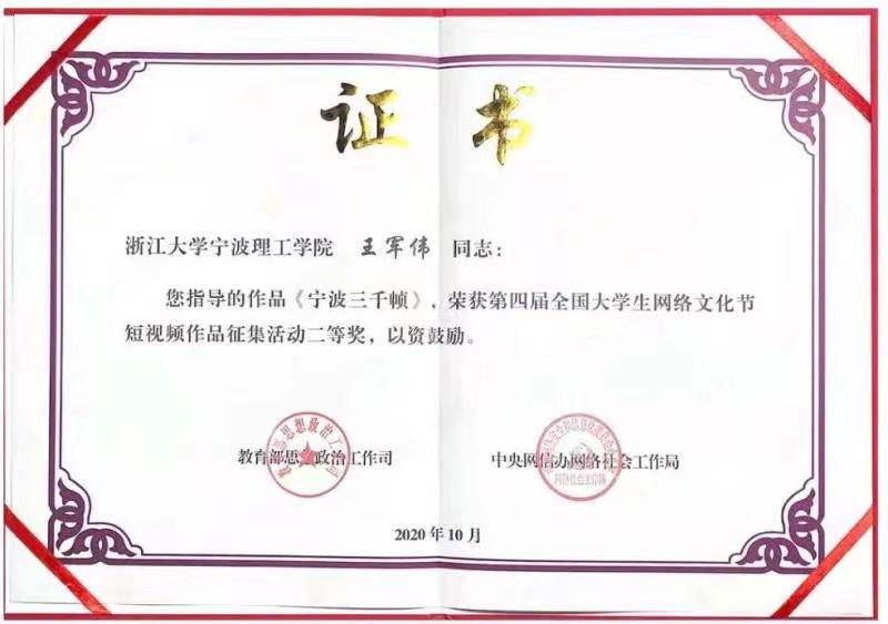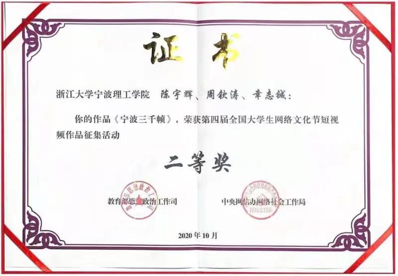 近日,9778818威尼斯传来喜讯,由学院学子陈宇辉、周钦涛和土木建筑工程学院幸志铖组成的团队(指导老师:王军伟)凭借作品《宁波三千帧》获得了第四届全国大学生网络文化节短视频作品征集活动二等奖。