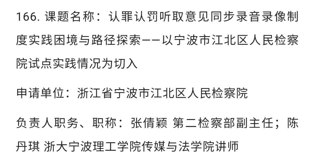 7月22日,最高人民检察院发布了《2022年度最高人民检察院检察应用理论研究课题立项公告》,我院教师陈丹琪联合宁波市江北区人民检察院张倩颖检察官承担的《认罪认罚听取意见同步录音录像制度的时间困境与路径探索——以宁波市江北区人民检察院试点实践情况为切入》课题获批立项。