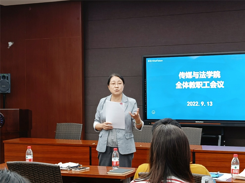 韩缨副院长汇报了开学第一周的线上教学情况,并希望大家能积极参与教研教改项目的申报。李志副院长表达了对大家信任的感谢,承诺做好服务工作,带领大家在学术方面登上新台阶。胡鹿鸣副书记首先汇报了开学初学生工作情况,强调师生防疫必须严格遵守学校政策,接着通报了2022届毕业生就业情况,进一步开展了廉洁教育和安全教育,并部署了下一阶段的分工会工作。