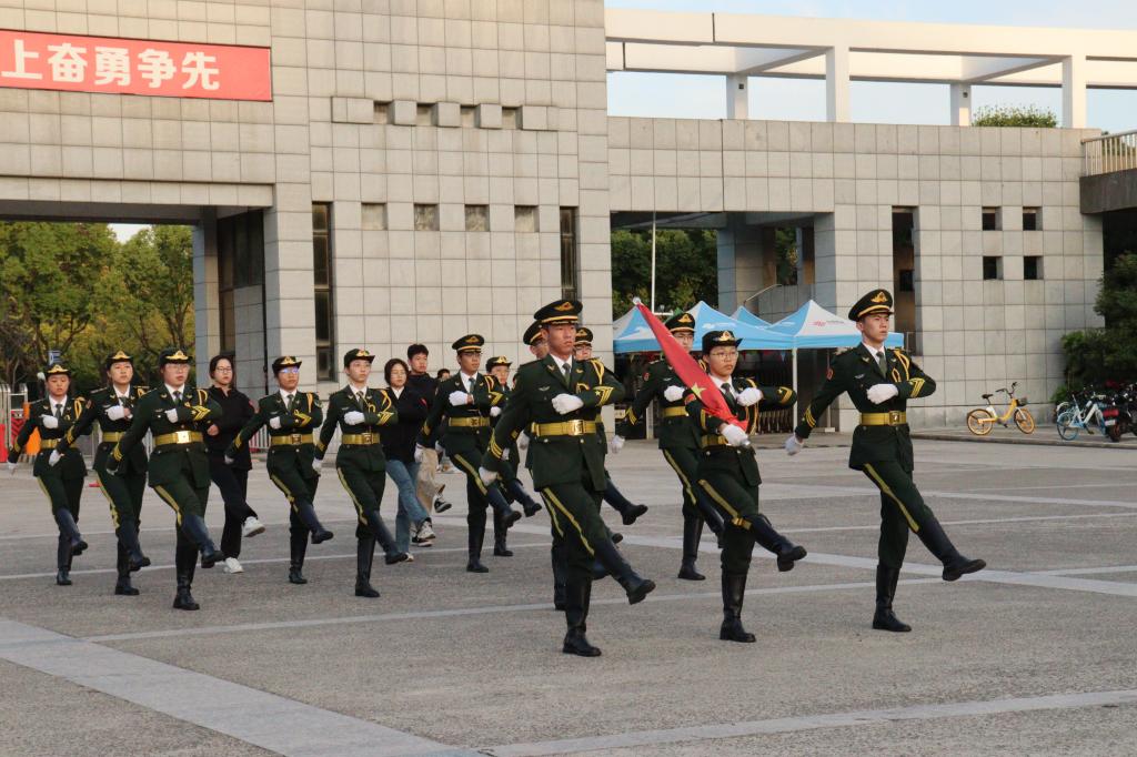 升国旗,奏唱国歌。国旗队迈着整齐有力的步伐,护送着红旗走向升旗台。在全体人员的注视下,五星红旗伴随着激昂嘹亮的歌声冉冉升起。