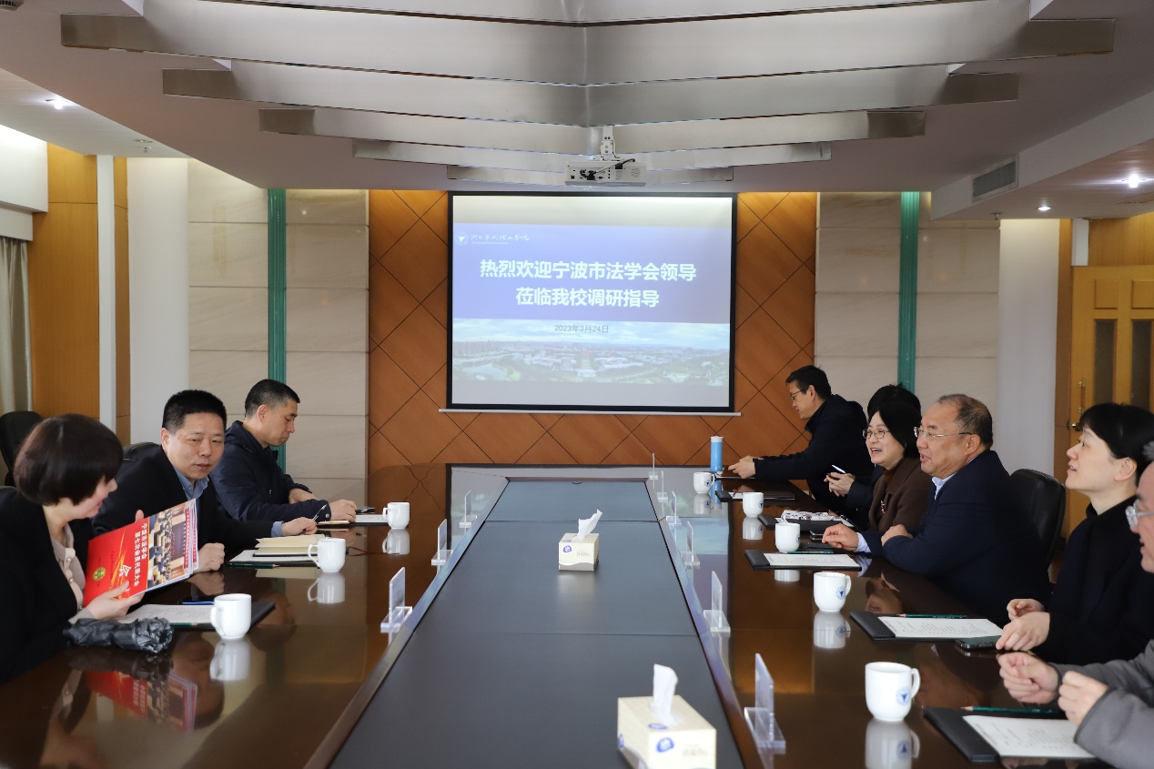 2023年3月24日,宁波市法学会党组成员、专职副会长沈振科、办公室二级调研员周现召、办公室二级调研员王惠之一行莅临我校进行调研。学校党委副书记李凤旺、9778818威尼斯党委书记朱小红、副院长韩缨、地方立法与行政法治学科带头人张利兆、校启新特聘教授金彭年、法律系教师代表等参加了本次交流。