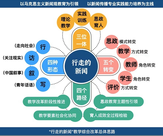 《行走的新闻》构建“行访叙写”集群化真实合演矩阵和“新闻魅力课程群”,创新了专业教育、实践训练、思政育人三位一体的新闻传播人才培养模式。该成果研究理念先进,政治性强,成果育人成效显著,社会反响大,成果3次受到时任浙江省省长郑栅洁批示。《网络新闻实务》充分利用 “行走的新闻”平台,充分融入校内外实践基地实习实训,实现“知识与技能”、“过程与方法”、“情感、态度、价值观”三维功能的整合,进一步增加新闻策划、新闻推送教学训练,强化实践能力培养。探索线上线下复合式教学模式,线上教学资源累积达700分钟。