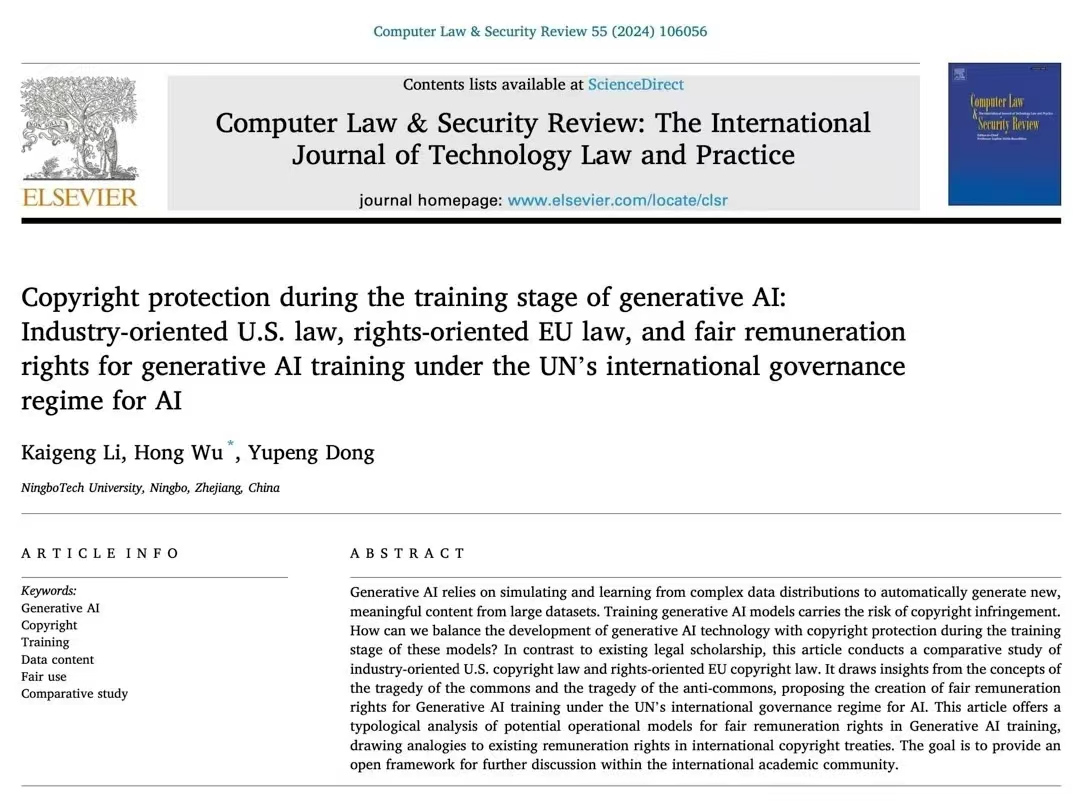 2024年10月,我院李凯更博士、吴泓副教授、董玉鹏教授在国际学术期刊《Computer Law & Security Review》上发表了题为《Copyright protection during the training stage of generative AI: Industry-oriented U.S. law, rights-oriented EU law, and fair remuneration rights for generative AI training under the UN’s international governance regime for AI》的论文。该期刊属于SSCI法学类一区期刊,并在421个SSCI法学期刊中排名第6(JCR分区排名)。