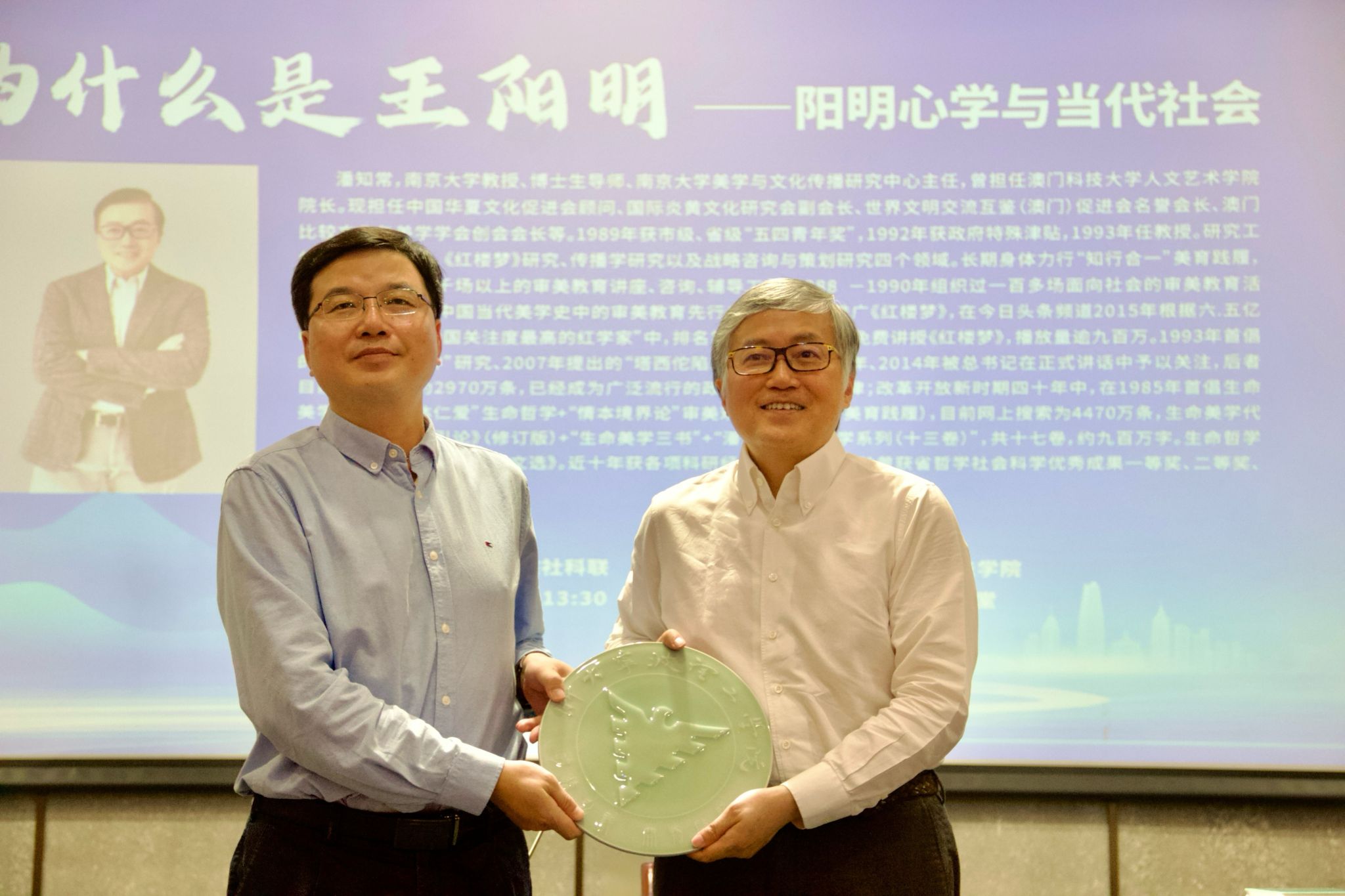 活动伊始,杨国富代表学校为潘知常教授送上了纪念品,同时,潘知常教授带来了自己参与撰写的一整套书籍赠送给学校。