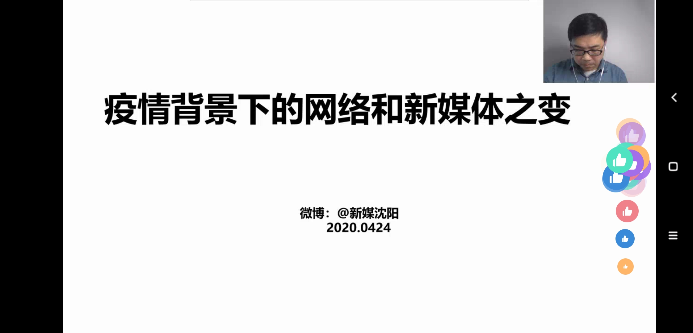 沈阳教授从大历史的角度动态观察了网络之变、新媒体之变和产业之变,具体分析了疫情后时代的经济社会民生走势。沈教授指出,疫情中传媒资源力量的互补式联动将人民的生命健康和知情权放首位,如“国务院客户端”高效地整合各类互联网+服务;以“健康中国”为代表的政务新媒体在权威防控、一手信息通报方面作用显著;微博和微信公众号平台也充分发挥了信息发布和救助服务功能……通过讲解,大家深刻地了解到,新媒体在此次疫情的报道中发挥的传统媒体无法替代的重要作用。新媒体最早揭露疫情,发挥预警作用;它辅助传统媒体,传递疫情相关信息;积极引导社会舆论,树立正确的价值观导向;检举不当行为,发挥媒体的监督作用;关注疫情中的个体,多角度提出了良性建议。