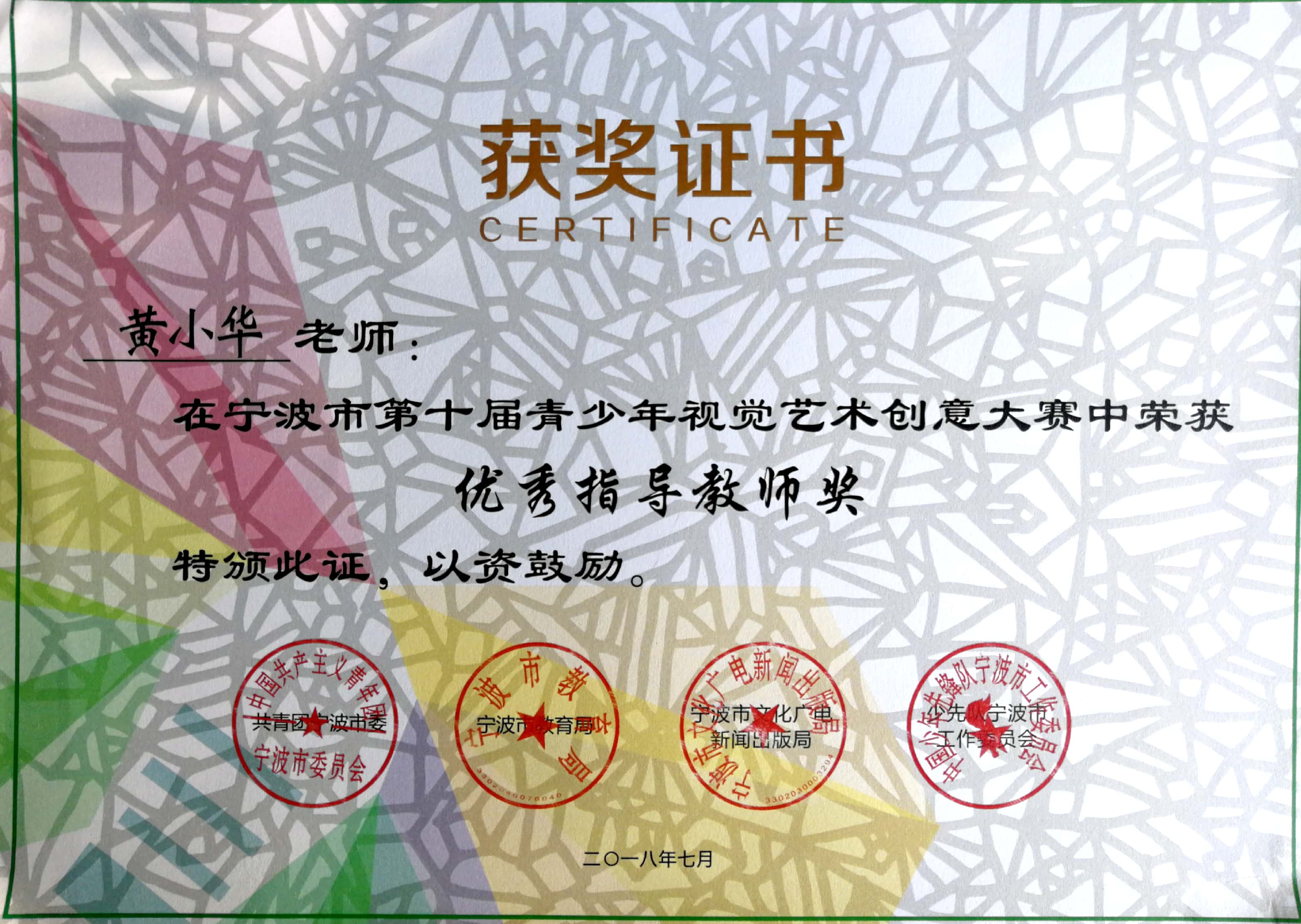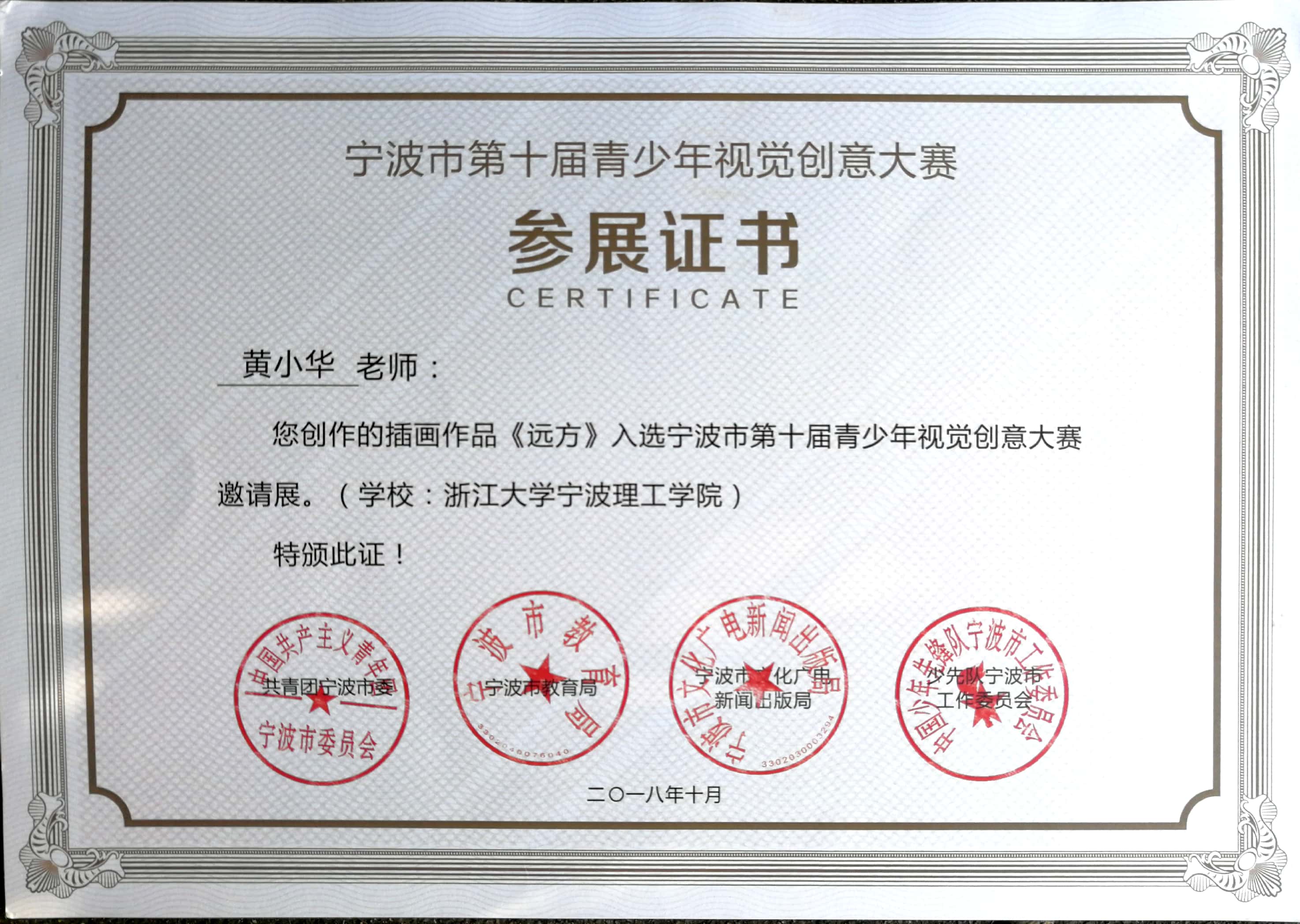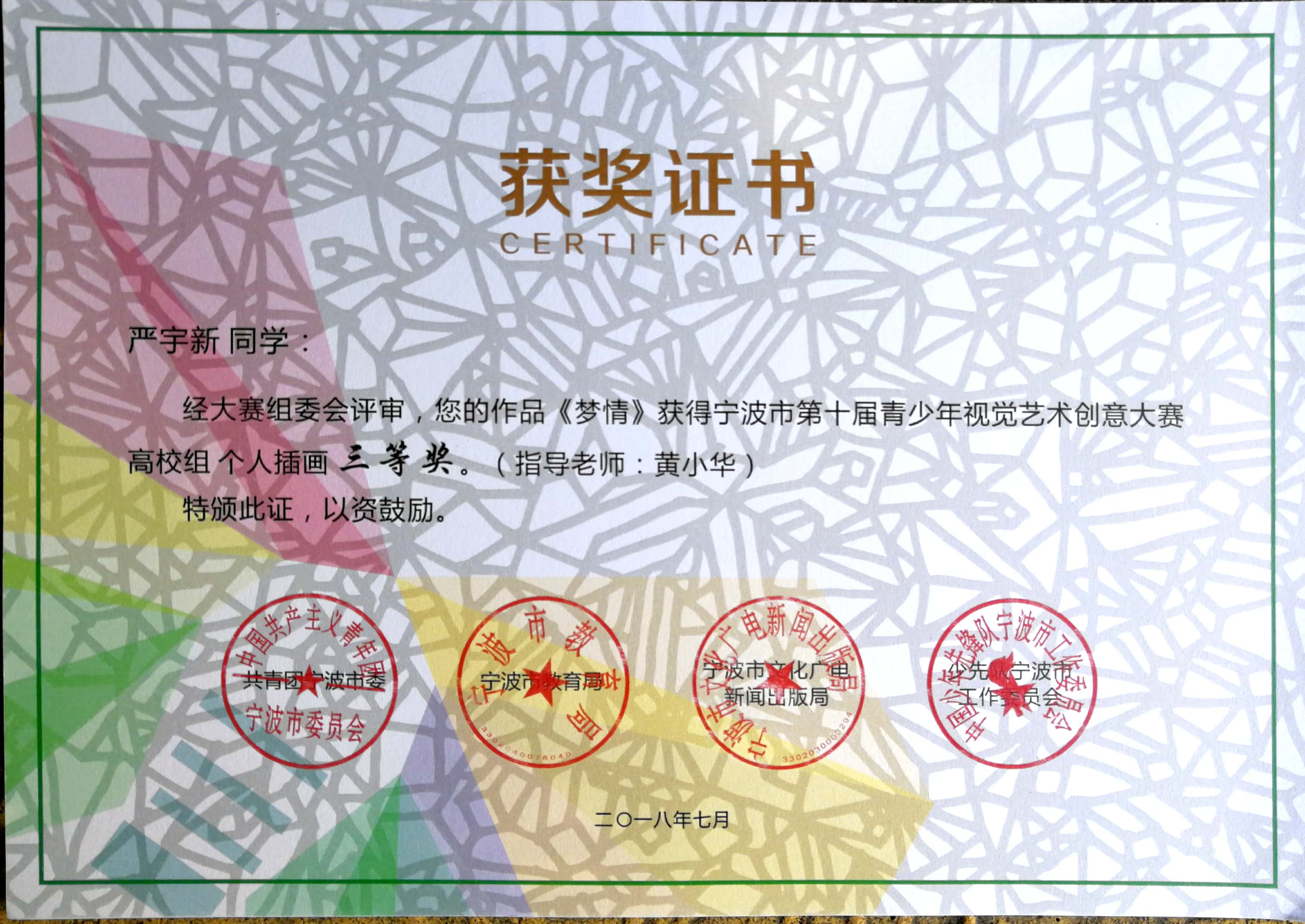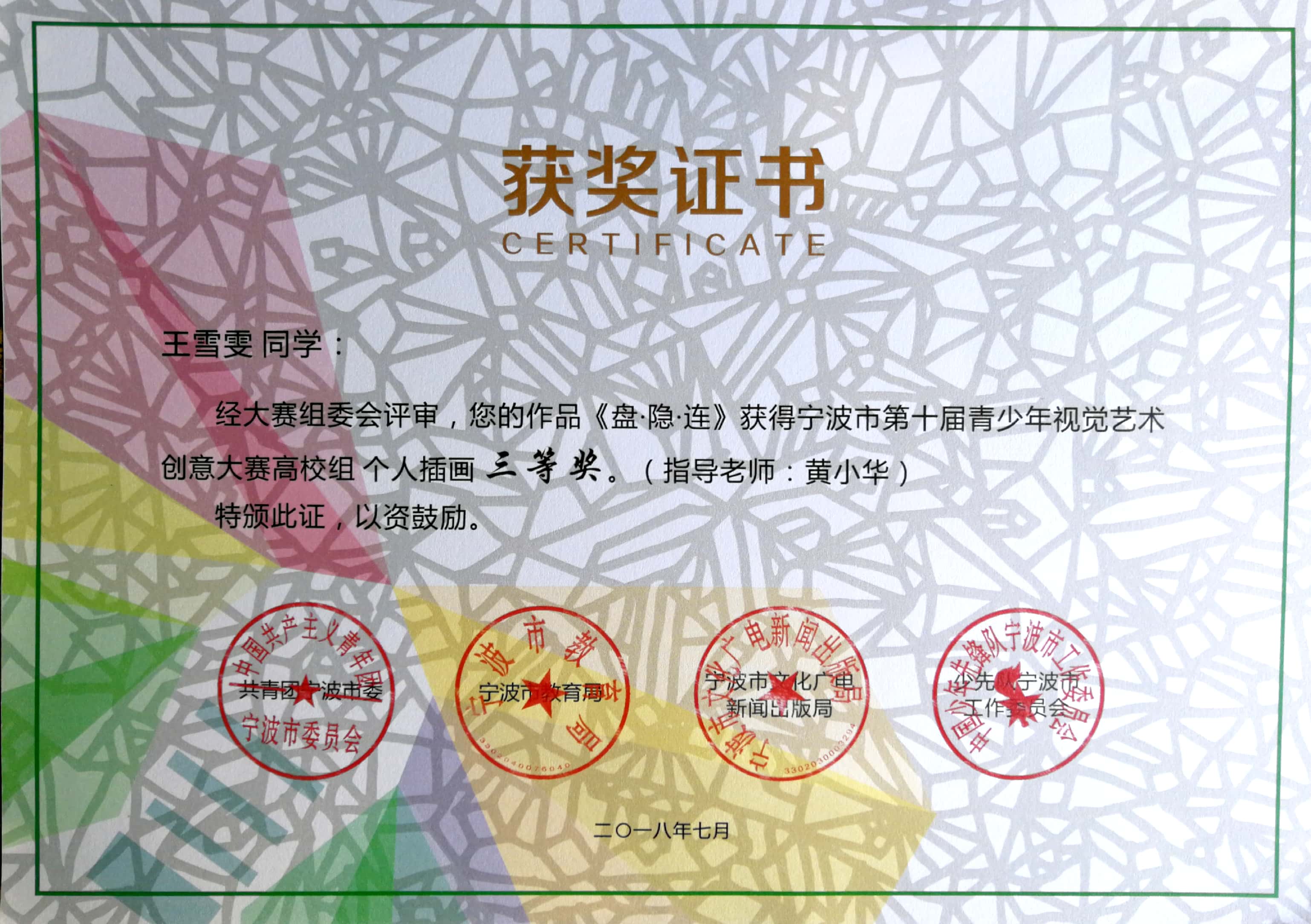 在2018年7月宁波市第十届青少年视觉艺术创意大赛高校组评选中,我校传媒与设计学院学生在此次大赛中获得两个三等奖。数字媒体艺术171班王雪雯的作品《盘.隐.连》获得大赛三等奖。数字媒体艺术173班严宇新的作品《梦情》获得大赛三等奖。此外,传媒与设计学院黄小华老师的个人插画作品《远方》、个人立体造型作品《平凡之路》两幅作品获高校教师专业组特邀参展,并荣获本次大赛的优秀指导老师奖。