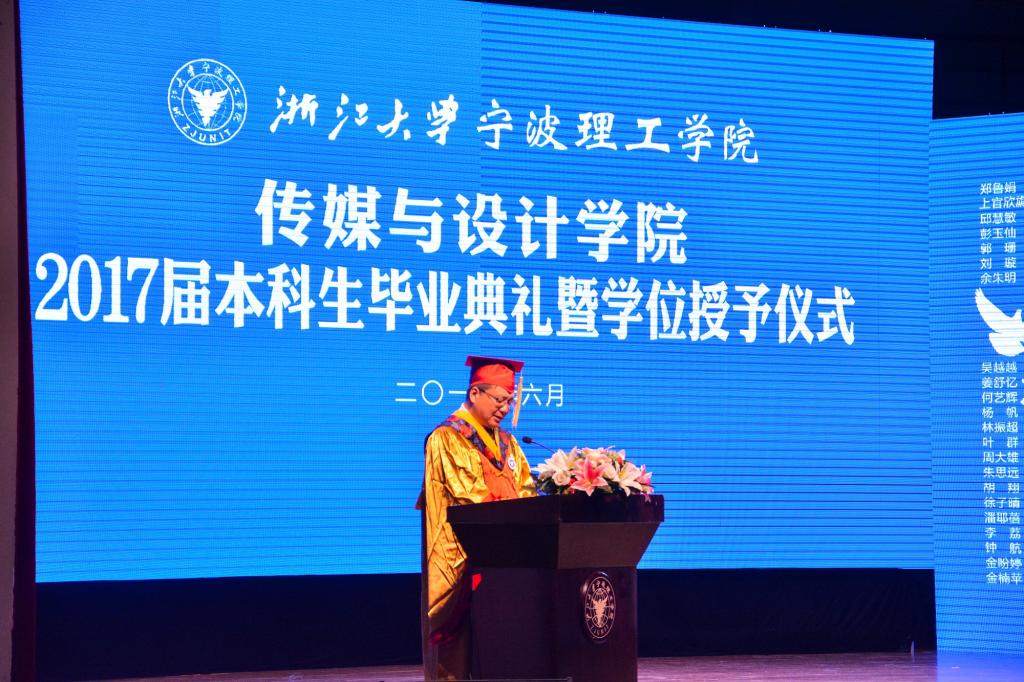 2017年6月18日下午在可珍讲堂,传媒与设计学院举办2017届毕业生典礼。300余位毕业生身着学士服参加典礼。在学校党委副书记黄光杰、学院“9211”特聘教授孙守迁、学院院长邵培仁教授、党总支副书记朱小红老师、副院长刘建民、何镇飚、由旭声教授等领导与老师,以及广大家长代表和低年级同学的见证和祝福下,毕业生们喜迎这一人生重要时刻。