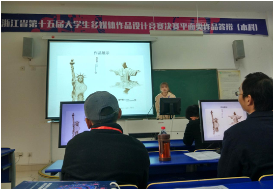 在指导教师励宇辉的带领下,入围同学前往浙江越秀外国语学院参加了决赛。同学们针对自己的作品进行了精彩的答辩,这样既锻炼了自己的设计水平又锻炼了语言表达水平。最终学院参赛者喜获佳绩,其中二等奖一组,三等奖两组。