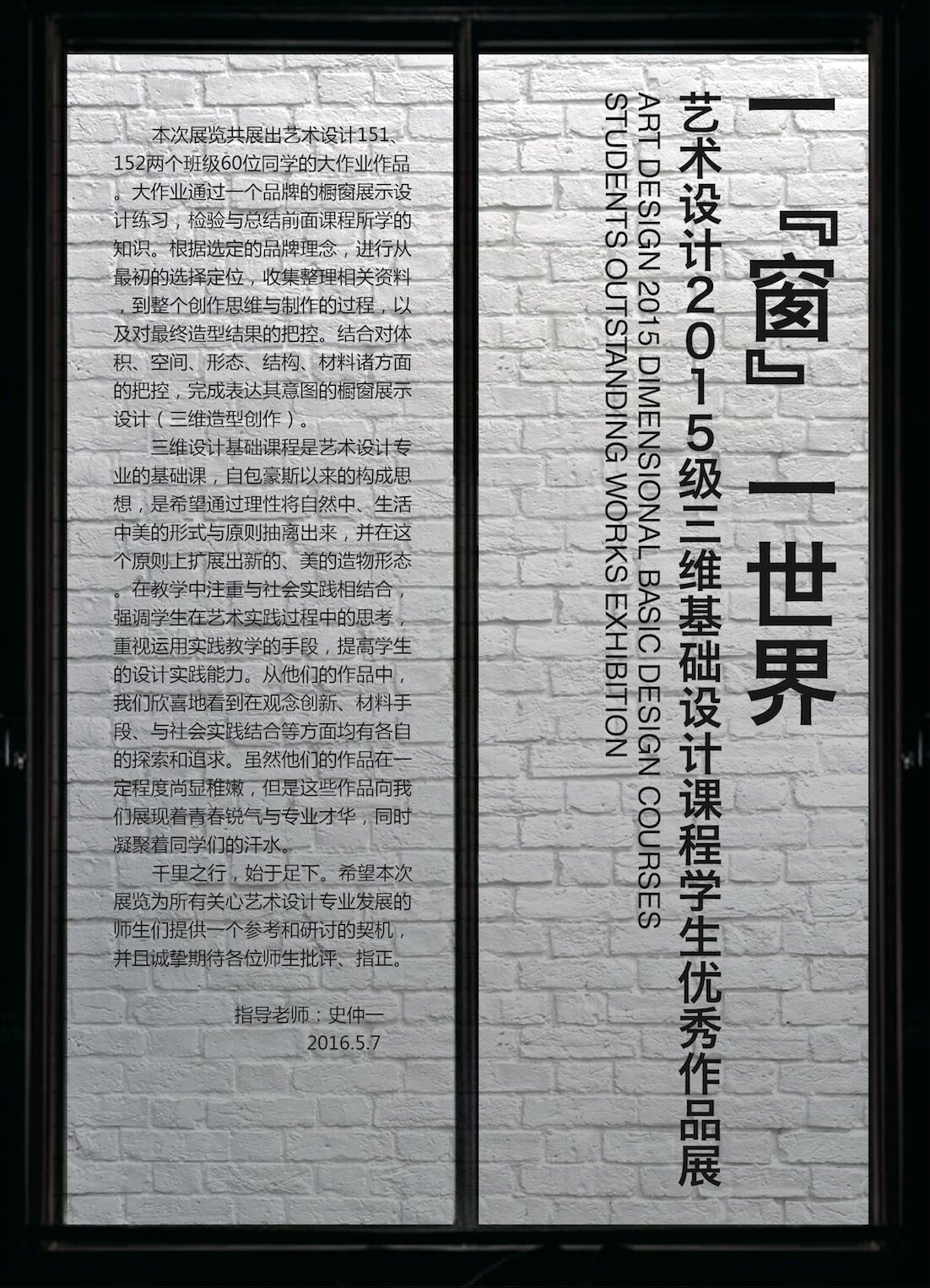 经过为期近一个月的设计制作,“一窗一世界”——环境艺术设计2015级三维基础设计课程学生优秀作品展于5月7日在SC一楼“传媒视界”展出。本次展览共展出艺术设计151、152两个班级60位同学的大作业作品。展示的作品均是通过一个品牌的橱窗展示设计练习,检验与总结课程所学的知识。同学们根据选定的品牌理念,开展了以下几个环节的工作:最初的选择定位,收集整理相关资料,整个创作思考与制作,以及对最终造型结果的设计。结合对体积、空间、形态、结构、材料诸方面的把控,同学们完成表达其意图的橱窗展示设计(三维造型创作)。