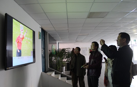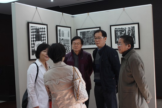 韩国代表们饶有兴趣地参观了学院SC101展厅,SC 3楼宣传廊的学生作品。观展过程中,代表们对陈子倩同学的木版画《狗精神》赞赏有加,该作品是以
