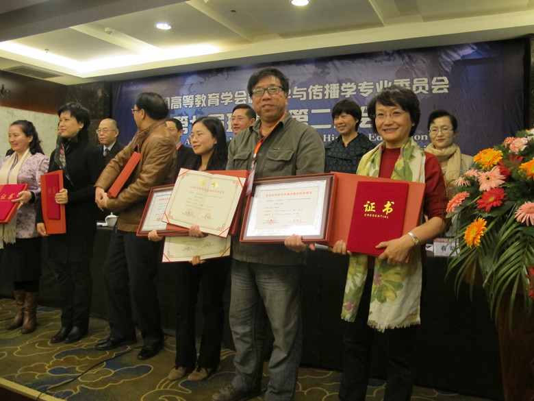 教育部新闻传播学教指委专家委员会主任委员、中国传媒大学高晓红教授将2013年度“中国新闻学与传播学教学改革创新项目”奖牌和证书颁发给了代表“行走的新闻”领奖的浙江大学宁波理工学院传媒与设计学院的刘建民老师。