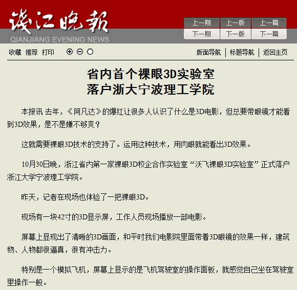 10月30日晚,浙江省内第一家裸眼3D校企合作实验室“沃飞裸眼3D实验室”正式落户浙江大学宁波理工学院。