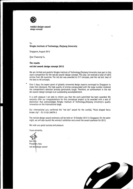 这次由传媒与设计学院赵建国老师指导,工业设计专业学生富超颖、张信夫、周翱翔、戴珍珍等同学设计的作品“Hook shaped fancy binder clip”(IS-12-02-34079-2)从来自全球56个国家3672份参赛作品的中脱颖而出,成功获得2012“红点设计概念奖”。