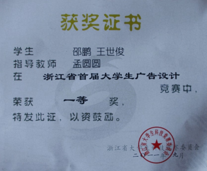 第四届全国大学生广告大赛浙江省一等奖,浙江省首届大学生广告设计竞赛一等奖
