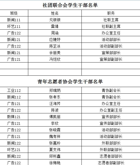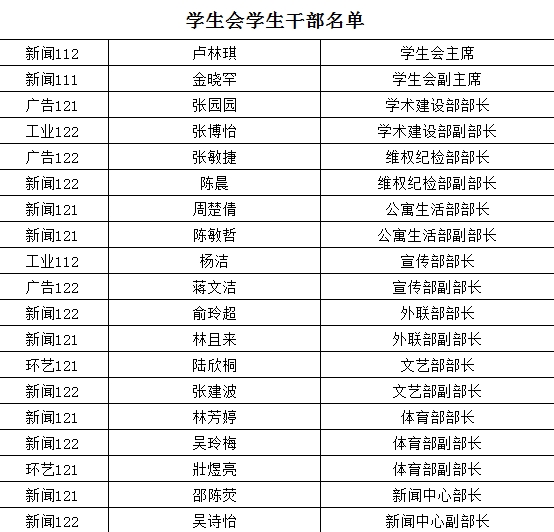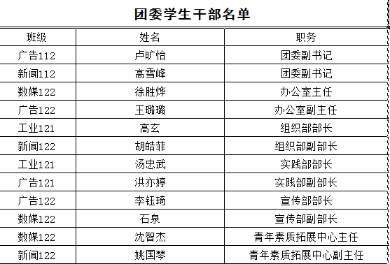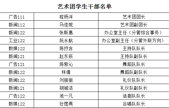 本着“公开竞聘、公平竞争、择优录取、民主集中”的原则,经过本人申请,笔试、面试以及组织评议,第二届传媒与设计学院团委、学生会、社团联合会、青年志愿者协会、艺术团学生干部换届选举选拔工作已经完成,现将名单公示如下,如有异议,请于2013年7月1日前到学工办(SC301)反映,公示期三天,逾期不予反映。