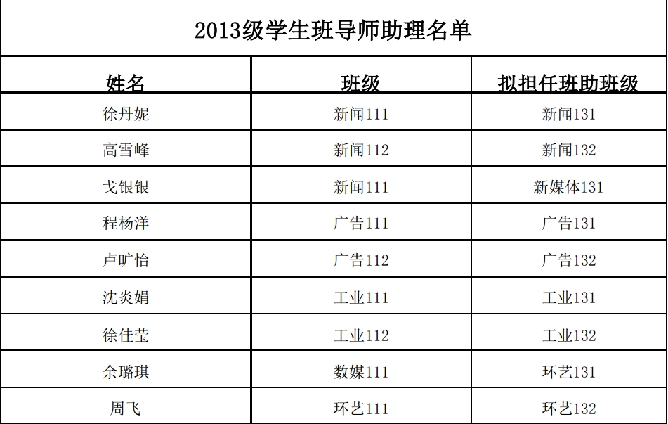 本着“公开竞聘、公平竞争、择优录取、民主集中”的原则,经过本人申请,组织评议,传媒与设计学院2013级学生班导师助理选拔工作已经完成,现将名单公示如下,如有异议,请于2013年7月1日前到学工办(SC301)反映,公示期三天,逾期不予反映。