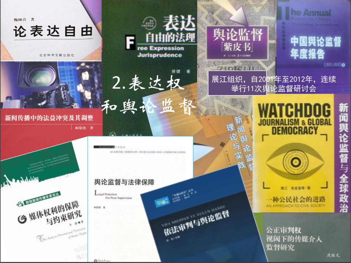 这第二块,是表达权和舆论监督。从人格权和新闻的冲突当中,势必引申出表达自由或者表达权的问题。这个问题有代表性的两本著作分别是甄树青的《论表达自由》和侯健的《表达自由的法理》。与之相关的研究,有的从新闻传播的权利冲突中来进行阐述,如阚敬侠《新闻传播中的法益冲突及其调整》,牛静《媒体权利的保障与约束研究》;另一个就是舆论监督问题。展江从2001年开始到2012年,12年中连续组织举行了11次舆论监督研讨会,这里看到的《舆论监督(紫皮书)》、《中国舆论监督年度报告(上下册)》,就是研讨会的论文集。看下面:展江和张金玺合写的《新闻舆论监督与全球政治文明》、王强华主编的《新闻舆论监督——理论与实践》,这两部书分别从学者角度和官员角度探讨新闻舆论监督。还有林爱珺的《舆论监督与法律保障》、徐迅的《依法审判与舆论监督》、庹继光的《公正审判权视域下的传媒介入监督的研究》等,有关舆论监督的著作也是大量的。