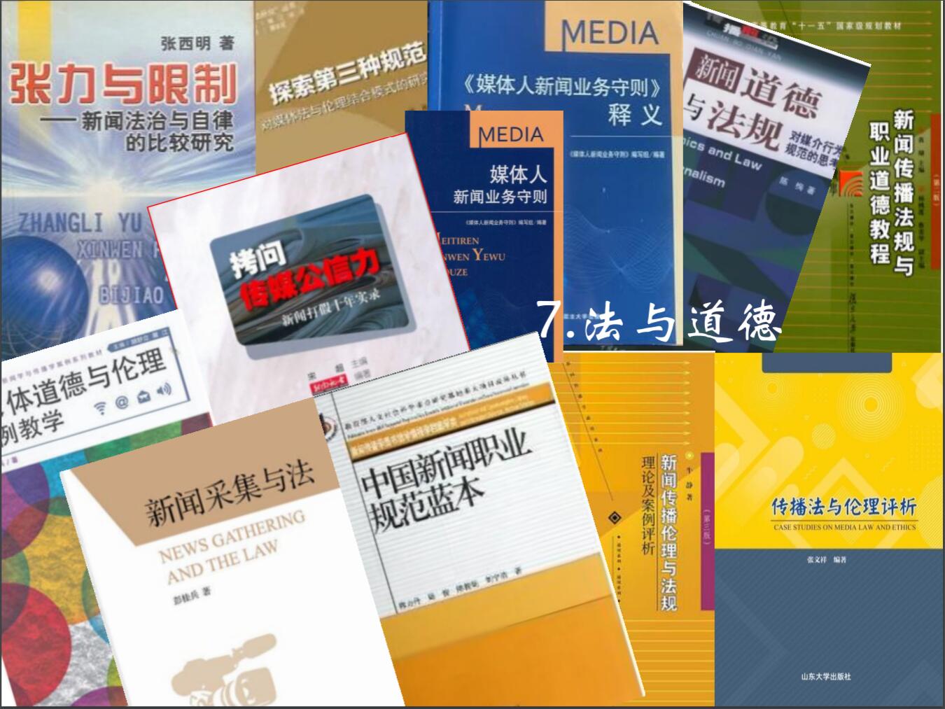 第七块就是法与道德。在新闻业界和学界,法和道德往往不分家,课程也叫新闻法规与道德,流行的南北两本教材:黄瑚的《新闻传播法规与职业道德教程》,陈绚的《新闻道德与法规》。值得一提的是张西明的《张力与限制——新闻法治与自律的比较研究》,此书谈到新闻法治作用在于保护新闻传播,自律主要是来限制新闻传播的,懂得自律的新闻人才能享有自由。徐迅后来也出版一本书《探索第三种规范》,并且按照这一指导思想,徐迅、阴卫芝等人共同制定写作《媒体人新闻业务守则》,同时出版了一部释义。在最近出版的有几本书中,值得注意的有彭桂兵《新闻采集与法》,张文祥《传播法与伦理评析》。预告一下:中国政法大学新闻传播学院刘斌领衔,阴卫芝、朱巍等参加的新闻法与道德的教材已经进入编审程序。