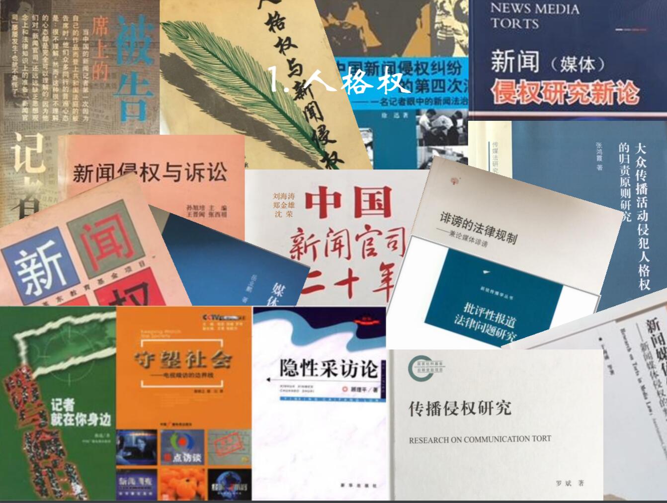 这第一块,是关于传媒法中的人格权问题。这是传媒法在发展过程当中首先提出的问题。最初三本分别是《被告席上的记者》、《新闻侵权与诉讼》和《新闻侵权法律词典》,均出版于1994年。次年,王利明、杨立新领衔出版《人格权与新闻侵权》。接下来,这方面的文章和著作可以说是大量的,突出的如徐迅《新闻(媒体)侵权新论》,收集了800个案例进行分析,提出一系列研究报告,并且还有一本60多个案例分析文集。再看中间:刘海涛、郑金雄的《中国新闻官司20年》,60多万字,新闻记者与法官合作,披露了若干内幕资料。这里还有,顾理平《新闻侵权与法律责任》、张鸿霞《大众传播活动侵害人格权的归责原则研究》、郑文明《诽谤的法律规制》、陈堂发《批评性报道法律问题研究》,林林总总,不胜枚举。究竟多少?至少几十本,也许上百本。有关研究一直持续到现在,2020年初罗斌《传播侵权研究》一书,80万字,对各类传播侵权问题做了详细分析。还可以提到三本研究新闻记者暗访问题的书,徐迅的《记者就在你身边》,顾理平《隐性采访论》,以及展江和郭镇之领衔的关于电视暗访问题的《守望社会》,从不同视角论述暗访。
