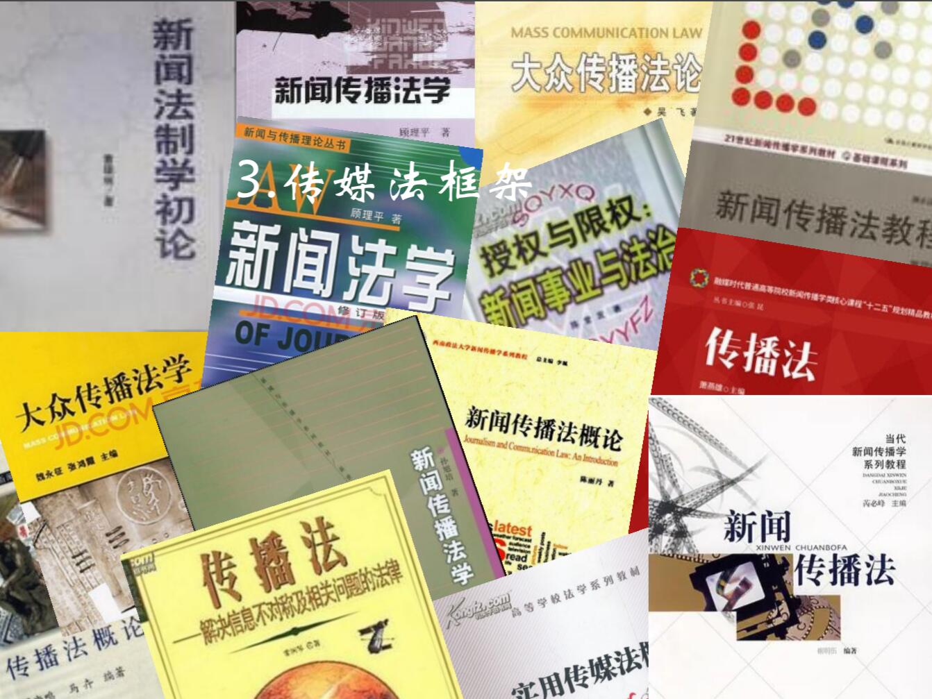 第三块是传媒法的框架,也就是尝试给传媒法建立起一个相对完整的体系。最初做出体系探索的学者是《解放军报》大校曹瑞林,这是他在1998年出版的《新闻法制学初论》。之后,一些学者也逐渐有关于这方面的著作,如顾理平写了两本:《新闻传播法学》和《新闻法学》;吴飞有《大众传播法论》;孙旭培有《新闻传播法学》,我本人和张鸿霞一起主编了《大众传播法学》,参加写作的,包括徐迅、匡敦校、徐明、王四新等,之后我又出版了《新闻传播法教程》,目前我正在和周丽娜修改第7版。还有陈丽丹《新闻传播法概论》,崔明伍《新闻传播法》等。我看到的这类书共有20多部。