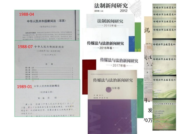 传媒法研究起源于上世纪80年代国家组织进行的《新闻法》立法工作,中国社会科学院新闻研究所是传媒法研究的发源地,我国最早一批有关传媒法研究文章就发表在该所出版的《新闻法通讯》上,共出版20多期,70万字,涉及当时有关传媒法研究的主要问题,表达自由、诽谤、更正和答辩、注册制还是许可制等等问题,都有讨论。有人说,这是我国唯一的有关传媒法研究的专门刊物,这不对。请看,这是西北政法大学新闻传播学院策划出版的《传媒法与法治新闻研究》,由原来的《法制新闻研究》改版,2016年以来每年出版一卷。这是中国传媒大学媒体法规和政策研究中心推出的电子刊物《传媒法律与政策通讯》,双月刊,8年共48期。