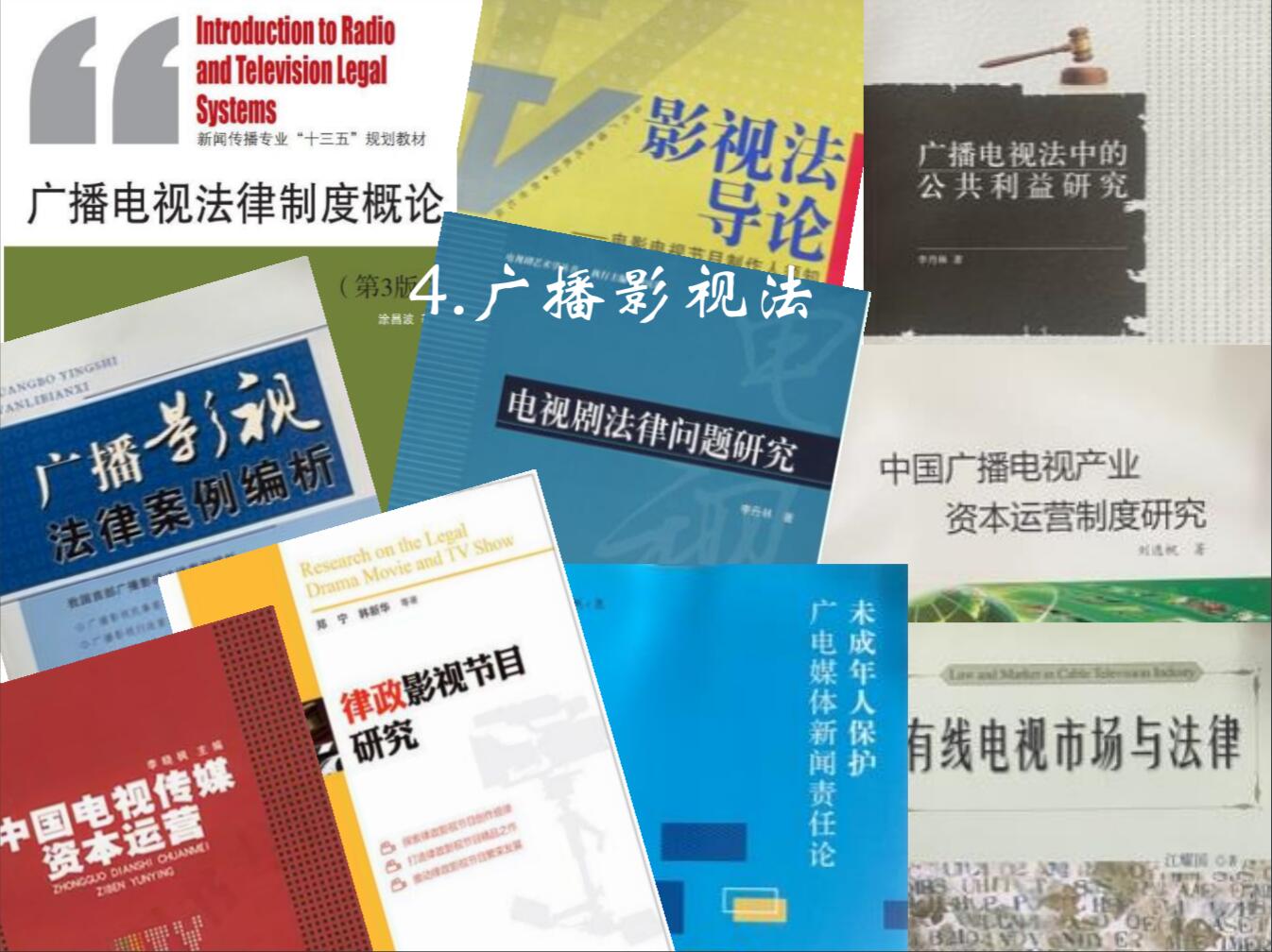 第四块是广播影视法。在这方面研究做得比较深入、比较长期的是涂昌波,他的《广播电视法律制度概论》已出三版。我同李丹林一起做过一本《影视法导论》。其他著作如李丹林《电视剧法律问题研究》、《广播电视法中的公共利益研究》;刘逸帆《中国广播电视产业资本运营制度研究》,以及他与王伟亮合著的《未成年人保护——广播电视新闻责任论》;郑宁和韩新华合著的《律政影视节目研究》。