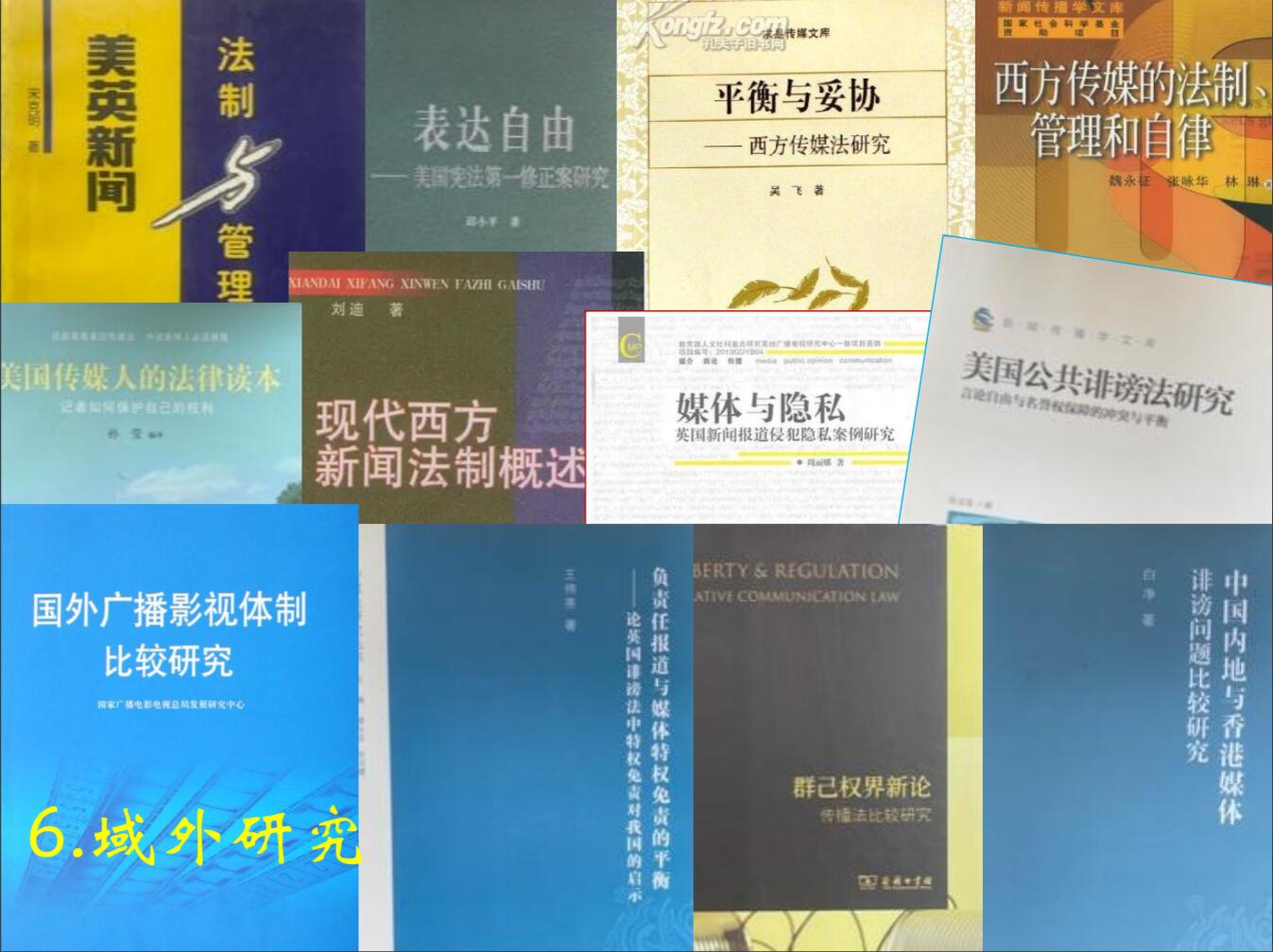 以上七块图书封面,难免挂一漏百。还有已经完成而尚未问世的成果,如李丹林和陈堂发都有国家重点(重大)课题已经结项,有待出版。顾理平、林爱珺等都有国家重点(重大)课题在研,至于有关传媒法的国家课题那就更多,不及列举。