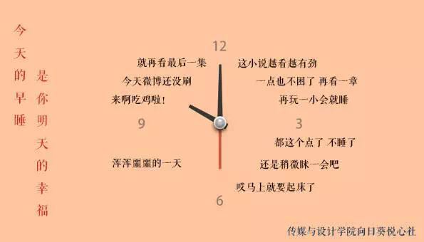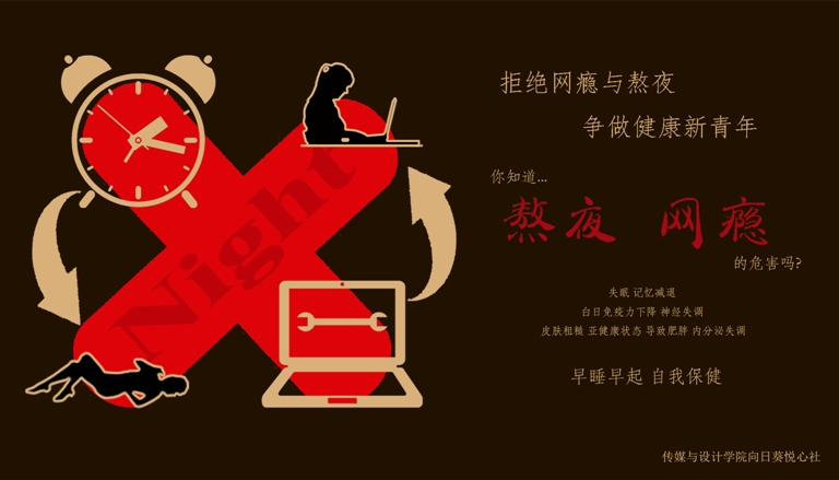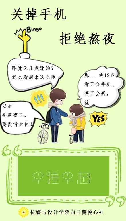 本次活动旨在加强大学生的自我管理和时间管理意识,拒绝无意义的网瘾与熬夜,争做身心健康的新时代青年。通过本次活动,大家知道了熬夜的危害,认识到作息不规律会对我们的身心健康造成极大的影响。门贴的创作与传播告诫同学们正确把握上网时间,合理作息才能拥有健康的体魄,才能更好地发挥自身的才干。虽然门贴征集活动已经结束,但提倡合理作息、拥抱身心健康的宣传还将继续。