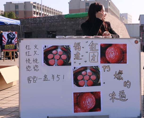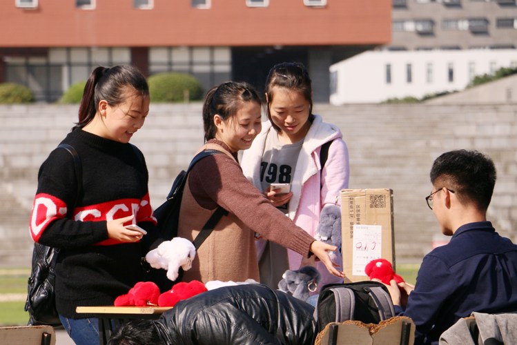 伴随着“双11”网购的热烈氛围,在暖和的阳光里以及在工作人员的精心安排下,创业的同学搬来了他们的商品,打出各类创意广告,开始了美好的创业时光。露天广场放着音乐,迎接着每一个来光顾的同学。中午下课期间,铺子吸引了很多同学,各个商家心潮澎湃,口若悬河,热情推销自家的商品。我们的铺子呈现的商品也是丰富多彩,有店家自己手工做的耳环铺,有数码3c周边铺,有自家制造的绒毛玩具或围巾铺,有进口零食铺,还有富有福建特色的小吃铺等等。每个铺子前面都是络绎不绝的人,店家忙着展示商品。买到自己喜欢的商品的同学也召集朋友们来关顾这些商铺。商家们忙活了一整天,收获的不仅仅是金钱,还有创业的惊喜。