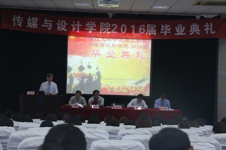 2016年6月19日上午8点传媒与设计学院2016届毕业典礼在NF103举行。出席本次大会的嘉宾有学校副院长俞春鸣,传媒与设计学院院长邵培仁,副院长刘建民、何镇飚、由旭声,以及学校“三江学者”彭增军教授。2016届全体毕业生、家长代表、各研究所教师代表、毕业班班导师、党政办和学工办老师共同参加了本次毕业典礼。