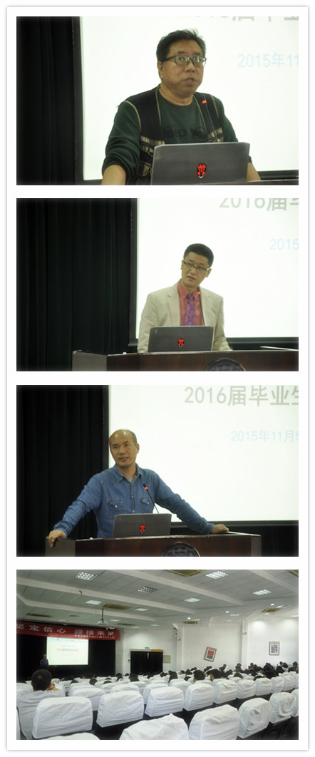 紧接着,何镇飚副院长作就业动员。何老师希望毕业生们在应聘前能够对所应聘单位多加以了解,做到准备充分、积极应聘,并澄清了以往学生对签就业协议的误区,强调签就业协议更多的是保障大学生的利益。针对考研的毕业生们,何老师强调一定要学好英语,因为英语不仅是难点,亦是增强学生考研信心的源泉。他建议毕业生们看无字幕的美剧,以快速提高英语水平。无论是直接就业还是选择考研或出国,何老师希望毕业生们选择一条自己感兴趣的又适合自己的路,并在以后的就业路上永远充满信心,积极乐观地迎接挑战。