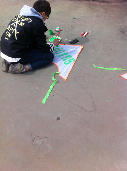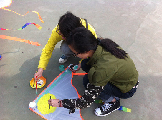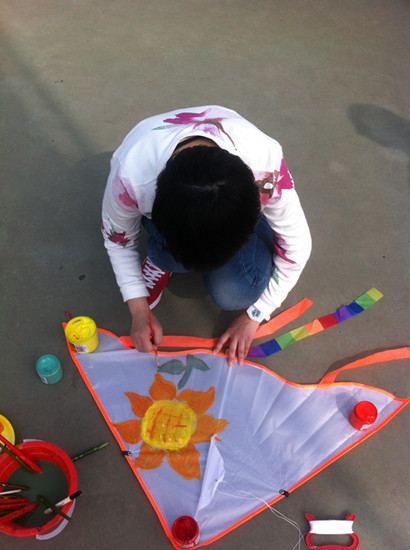 在放飞风筝之前,同学们先对空白风筝进行涂鸦设计,将自己的心愿和梦想化成缤纷色彩描绘在空白风筝上。有的画了小黄鸭,希望自己未来的日子简单、快乐,有的画了向日葵,希望自己永远阳光、坚强,有的写了“fighting”,希望自己把握时间、充满战斗力。经过一番精心的涂鸦设计,空白风筝摇身一变成为五彩斑斓的梦想之筝,同学们纷纷将风筝放飞于蓝天之上。
