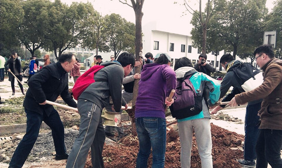 活动具体分为两个部分。第一项流程是种植树木,同学们热情高涨,团结协作,干劲十足。经过一个多小时的劳动,共同种下树木十余株。接着活动进入第二流程,志愿者分别拿到由青协宣传部制作的十二份DIY树牌,挂到自己亲手栽种的树木上并与其合影。活动现场气氛一度活跃,吸引不少过客。