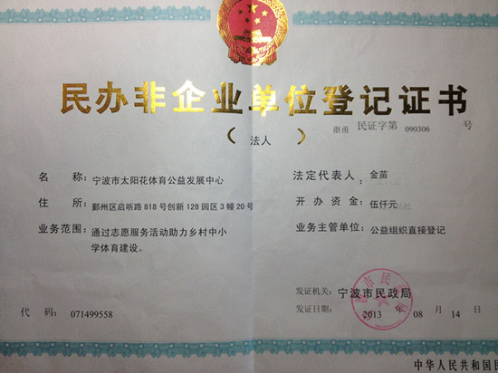 “太阳花体育”全称为“宁波市太阳花体育公益发展中心”,是一个非营利性公益组织,旨在帮助中国贫困地区的青少年和儿童,通过参与可持续的体育锻炼和运动,实现德智体全面发展,收获身心快乐健康成长。该组织的核心成员是浙江大学宁波理工学院的4名在校大学生,他们分别为传媒与设计学院的金苗和王晗,管理学院的郭丽婷和信息与工程学院的陈江。太阳花体育于2013年8月在宁波市民政局完成注册,并聘请了上海融恩资本投资咨询有限公司董事长宋海旭和央视著名播音员冯殊担任理事,在“百度百科”上也有专门的词条。