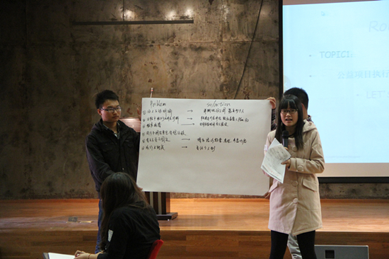 下午的活动主要是圆桌会议,就“公益项目执行中遇到的问题和解决方法”和“公益组织如何合作及分享资源”两个问题,与会组织代表分组进行了激烈的讨论,并在讨论结束后由小组代表进行上台分享讨论成果。此次公益论坛对于传媒青协意义重大,这不仅表明传媒青协在“立足校园”目标达成后,走出了学校,获得了校外同类组织的关注。论坛最后,协会将一件手绘中国风T袖作为礼物,赠送给了此次论坛主办方宁波黑苹果公益组织,黑苹果也将他们的一件会服与一本袁岳老师编写的《趁年轻,折腾吧》作为回赠。至此,传媒青协公益论坛行取得圆满成功。