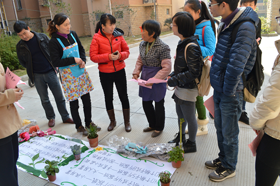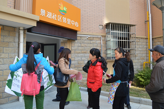 11月30日,浙江大学宁波理工学院传媒与设计学院青年志愿者协会在景湖水岸社区开展志愿者活动。该志愿活动以环保和关怀老人为主题,在前期准备了好几个月后终于正式走进社区。