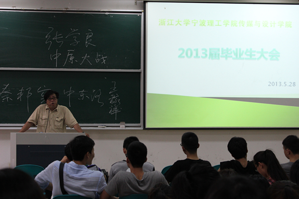 5月 28日 下午,传媒与设计学院在SC103召开了 2013 届毕业生大会。党总支副书记朱小红、副院长刘建民等老师参加了会议。