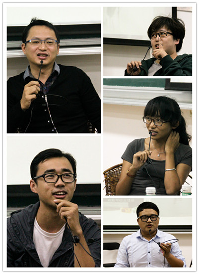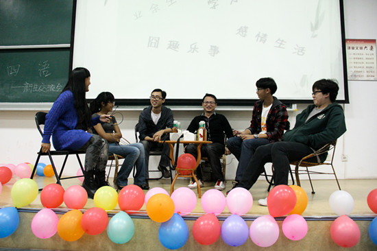 首先学术建设部和公寓生活部的干事们表演了一段精彩的《江南style》开场舞,赢得了同学一阵欢呼与掌声。接着交流会上半场“四语流年”开始,主持人与嘉宾老师以座谈对话的形式展开了交流,四位老师通过回忆当年的大学生活并结合自己的经历向在场的同学介绍了自身对于专业、学习以及个人情感等问题的认识,并对学生提出的不同的问题给予了回答和建议。姜燚威老师说:“每个人都要有自我,要走自己适合的路,找到自己适合的学习方法,并为之努力。”