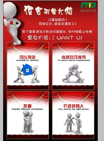 “宿舍形象大使”是在改选寝室长的基础上,推选出的一个复合寝室长的形象,承担了更多的荣誉和责任。它涉及到宿舍卫生值日安排,宿舍文化环境设计、宿舍安全提醒、宿舍“流动日志”记录、宿舍团队合作展示、宿舍导师联系等内容,以期通过一个崭新形象的塑造给予宿舍一个正面引导和激励。