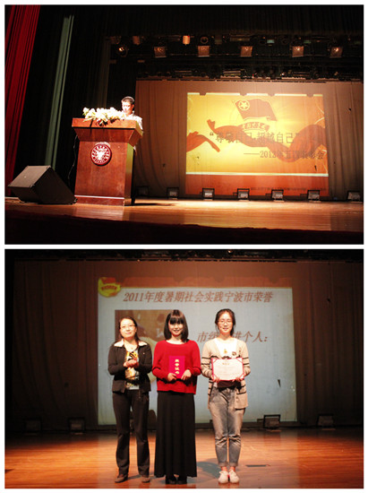 会议接着颁发了2011年度校优秀团员、优秀团干及优秀团支部荣誉称号,2011年度暑期社会实践宁波市优秀团队、优秀个人荣誉称号,2012年度“社会观察与实践奖”等各项奖励。