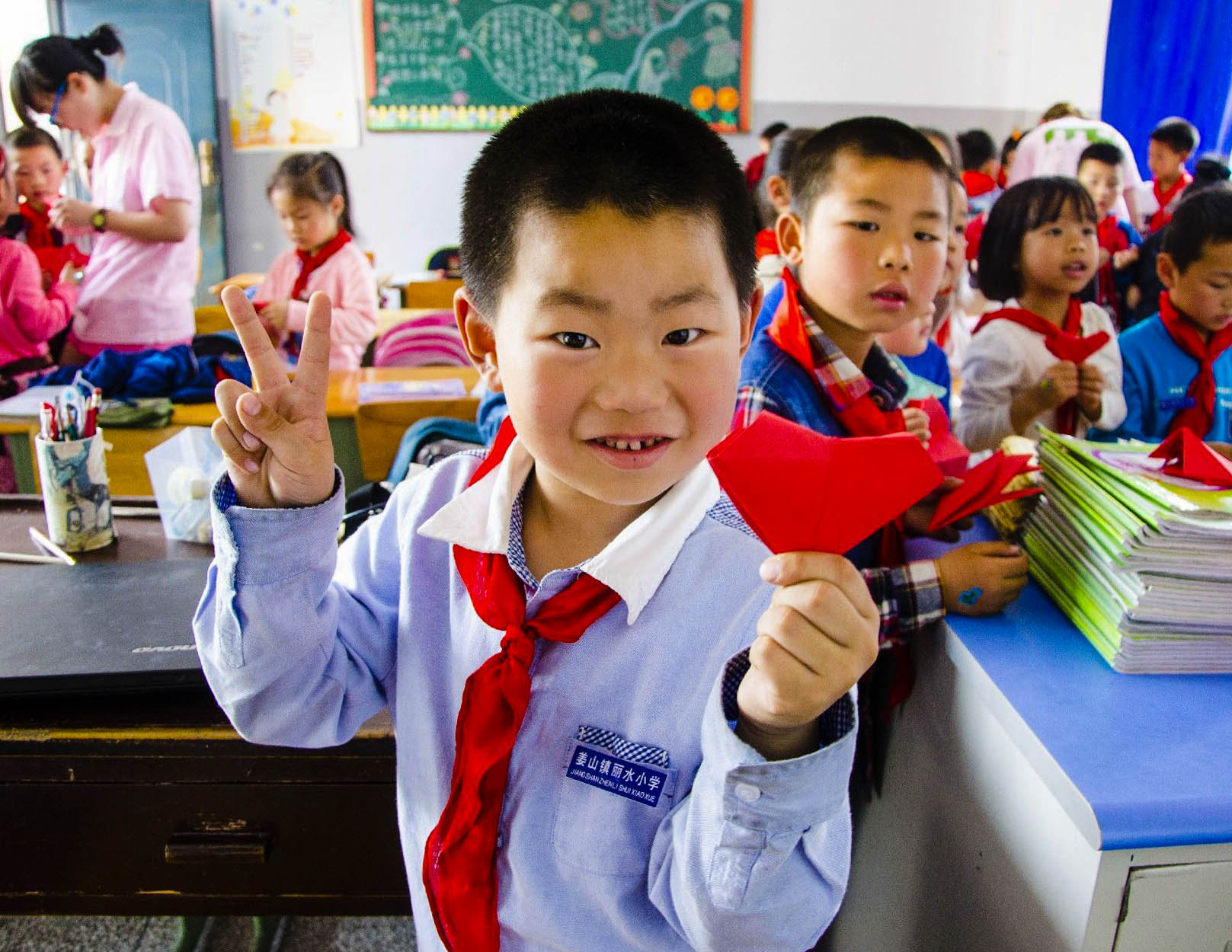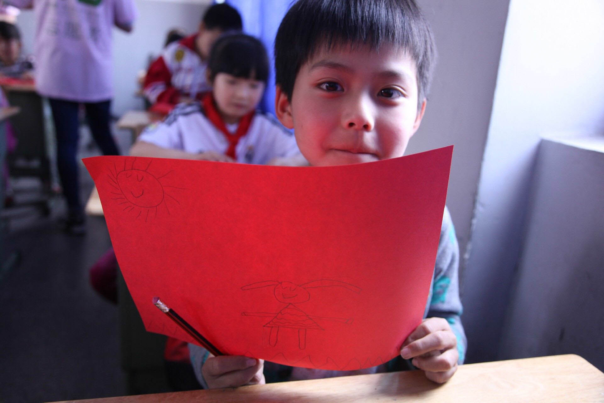 铃声响起,孩子们在各自的座位上坐好,开始上课。第一堂课的内容为"感恩的心,感谢父母"。课堂上,志愿者和小学生通过讲课,绘画,折纸等环节进行课堂互动,班级温馨和爱的气息逐渐弥漫,感染到每一个学生。