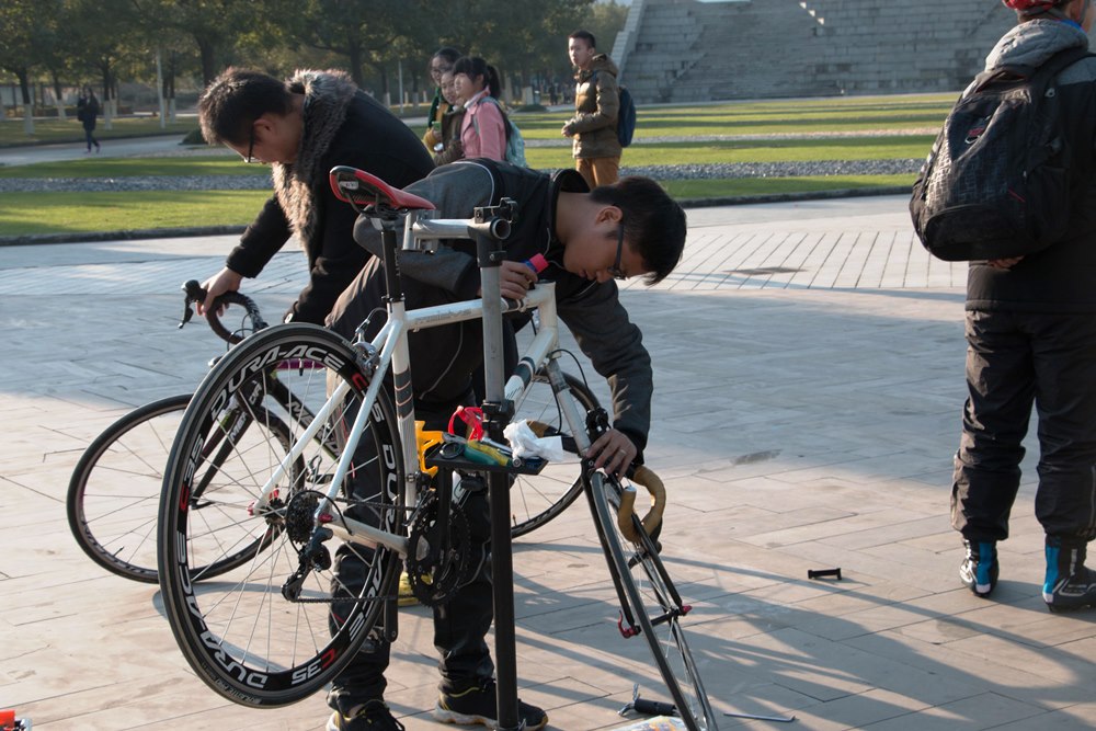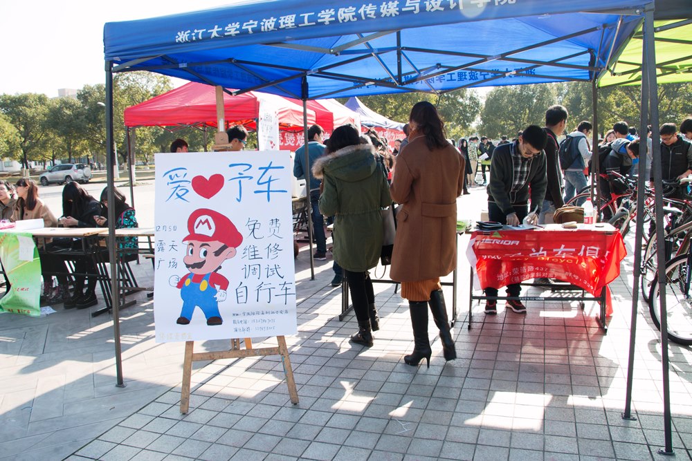 12月5日是国际志愿者日,为扩大我校青协影响力度,创建校园文明,弘扬“奉献、友爱、互助、进步”的志愿精神,各个分院青协都在露天广场举办了自己独特的活动。传媒青协与美利达和作,在露天广场“爱心予车”,为广大师生提供免费修车、试骑服务。