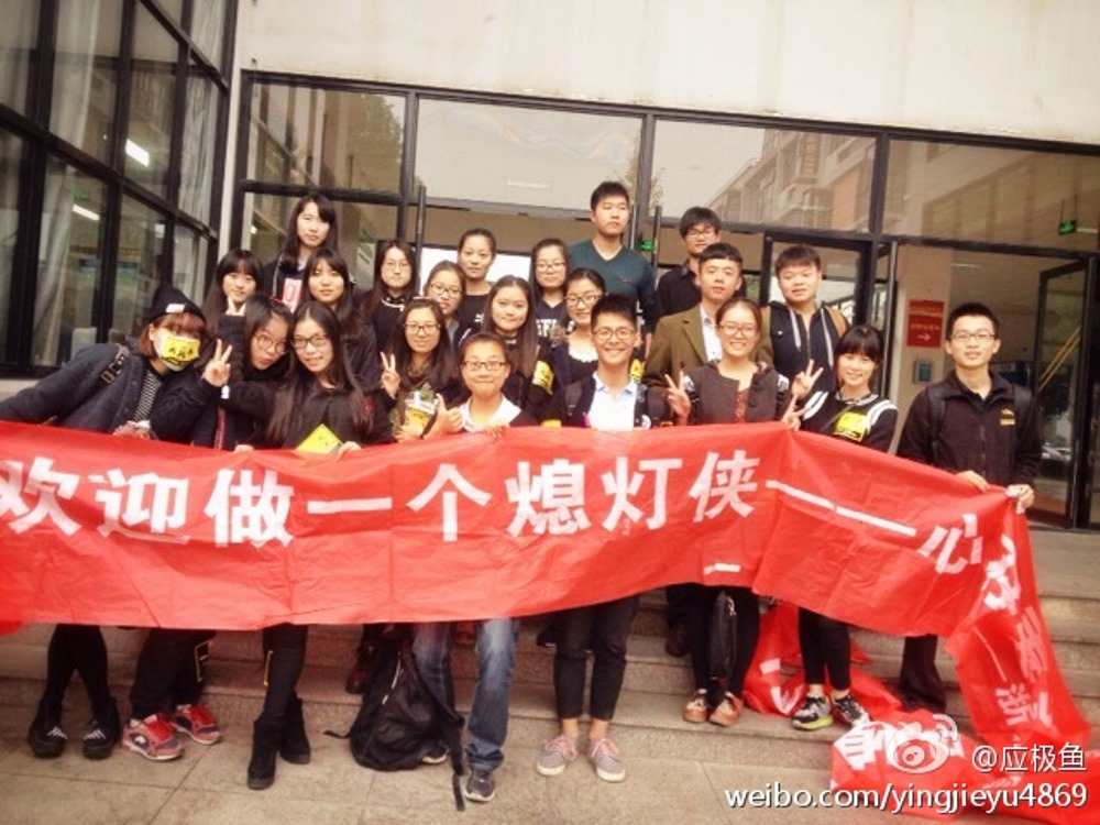 2014年11月29日,浙江大学宁波理工学院传媒与法律党总支的党员志愿者们在自己学校的校园招聘会开展了宣传“熄灯侠——倡导文明驾驶,适时熄灭远光灯”的活动。