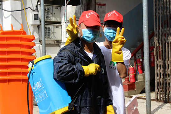 此次志愿服务主要分为两组:3位女生在村民代表石福娣女士的带领下,对石家村未发到消毒片的地区片进行分发,她们穿梭在大小巷之间,细心跟村民讲解怎么使用消毒片,并在分发的同时不忘继续去年的活动——回收废电池;4位男生则在村委会办公室帮忙整理电线,接插头。随后,他们全副武装,分别在首南医院医生和石家村妇女主任柯亚顺女士的带领下分成两拨对村里的道路和公共厕所进行了彻底清洁和消毒。