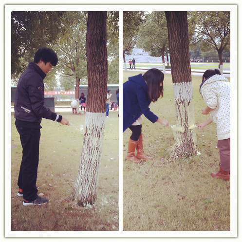 冬季来临,树干粉刷涂层,即可以起到保温防虫的作用,又能提高树木成活率。在寒冷的冬季,志愿者们用实际行动捍卫了绿色,为来年春天的校园布满了盎然绿意。