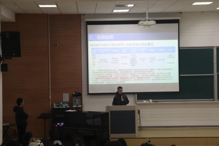 梅呈龙进行了征兵宣讲,为积极打好毕业生“征兵”主动仗,从思想上教育引导学生投身军营,提高学生参军觉悟和意识,此外,梅老师还介绍了征兵的相关政策和报名流程,对学费补贴和优待金进行了说明,并欢迎同学们向他咨询相关问题。